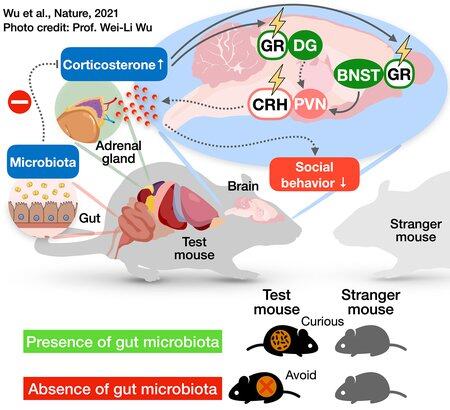It had already been shown that, on a chemical level, germ-free mice have significantly higher levels of the hormone corticosterone (the analog of the so-called stress hormone, cortisol, in humans) than mice with healthy microbiomes. The team of researchers, led by former Mazmanian lab postdoctoral scholar Wei-Li Wu, aimed to identify the neurons that were both affected by corticosterone and played a role in social behaviors.