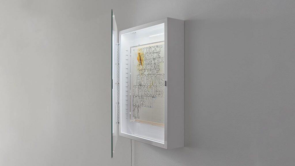 Visitors to the physical space will enter an immersive installation under a literal cloud of objects that have come to symbolize the pandemic. The centerpiece of the show is a selection of works from Pope.L’s Skin Set Project, an ongoing series of text-based drawings and paintings featuring elliptical aphorisms that call attention to the way color is deployed to categorize people. An arrangement of medicine cabinets with mirrored doors left ajar will be lit from the inside, inviting visitors to get a better look at the works contained within. The subtle play of prompts and references will animate the gallery as a space where notions of access—to art, to meaning, to health care—are entangled with those of color as conventional markers of identity.