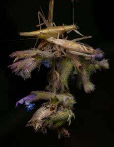 A male and a female tree cricket on a plant. In this cricket species, the males sing to attract the females, and being loud is advantageous because the sound travels further to more potential mates. (Natasha Mhatre photo)