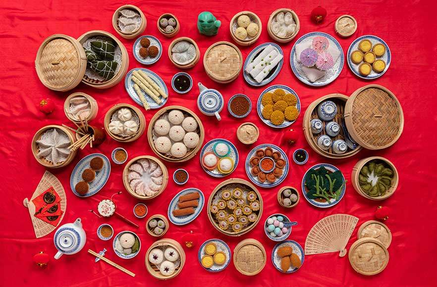 During Auckland’s lockdown in late 2021, Moon began knitting a yum cha banquet to mark what would have been her late mother Yip Sue Yen’s 90th birthday in March 2022, and to honour her grandmother Lee Choy Kee, whose skills of knitting and cooking were passed down the generations.
