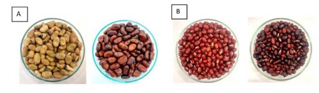 Seed coat darkening in faba (A) and adzuki (B) beans after 9 months of storage. Left: stored at 4 °C / 25% RH, seed coat colour unchanged. Right: stored at 40 °C / 80% RH, seed coats show clear darkening.