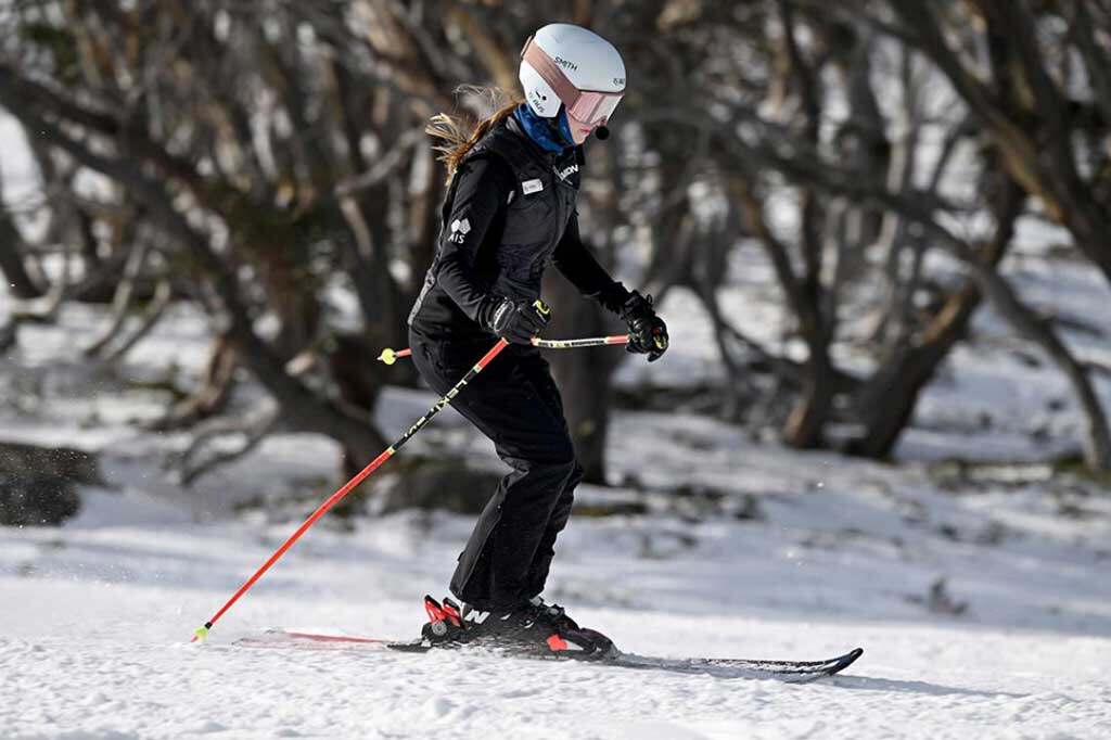 Georgia Gunew launches from the start gate, carves down the mountain at close to 100km/h, guided by a voice in her ear.